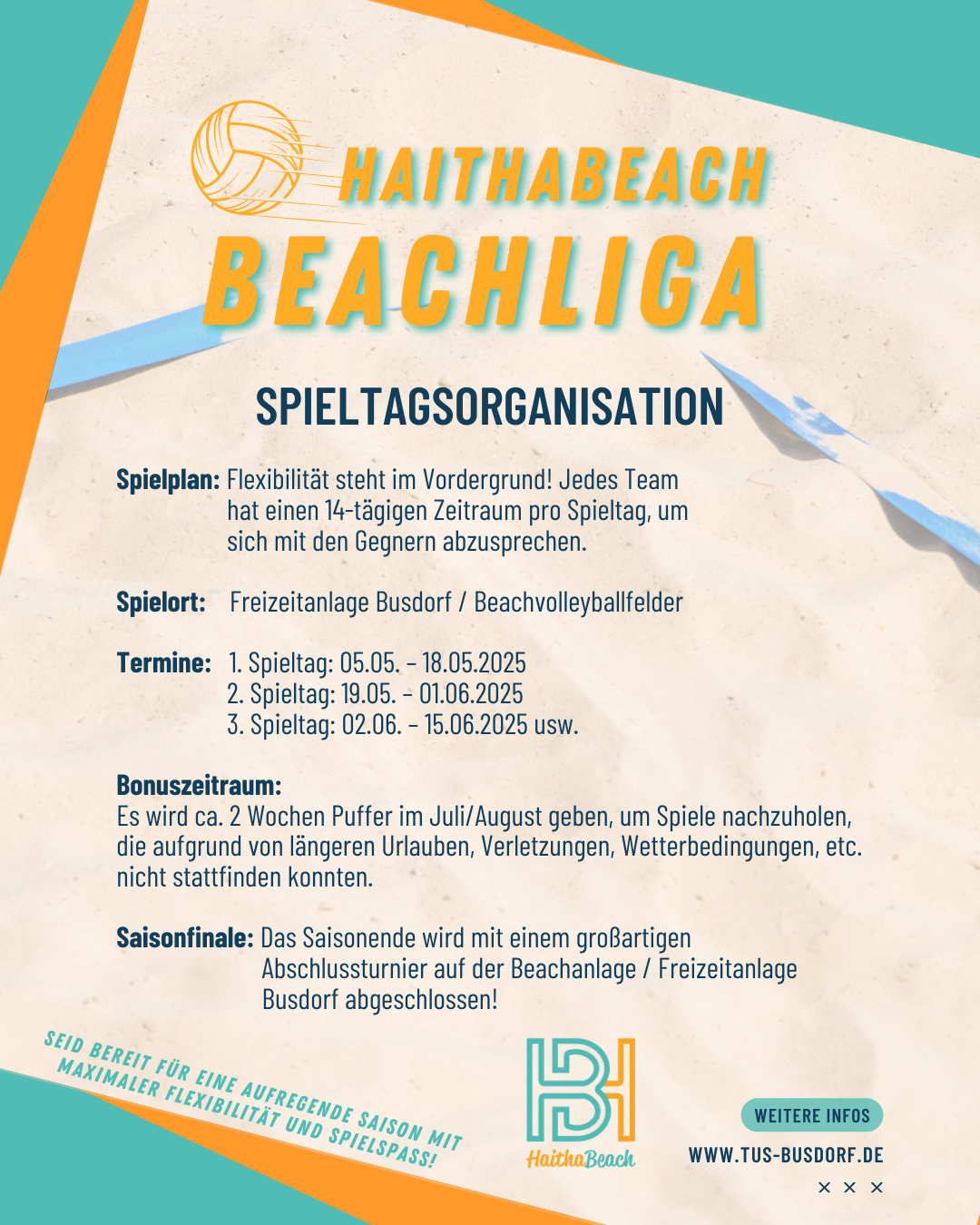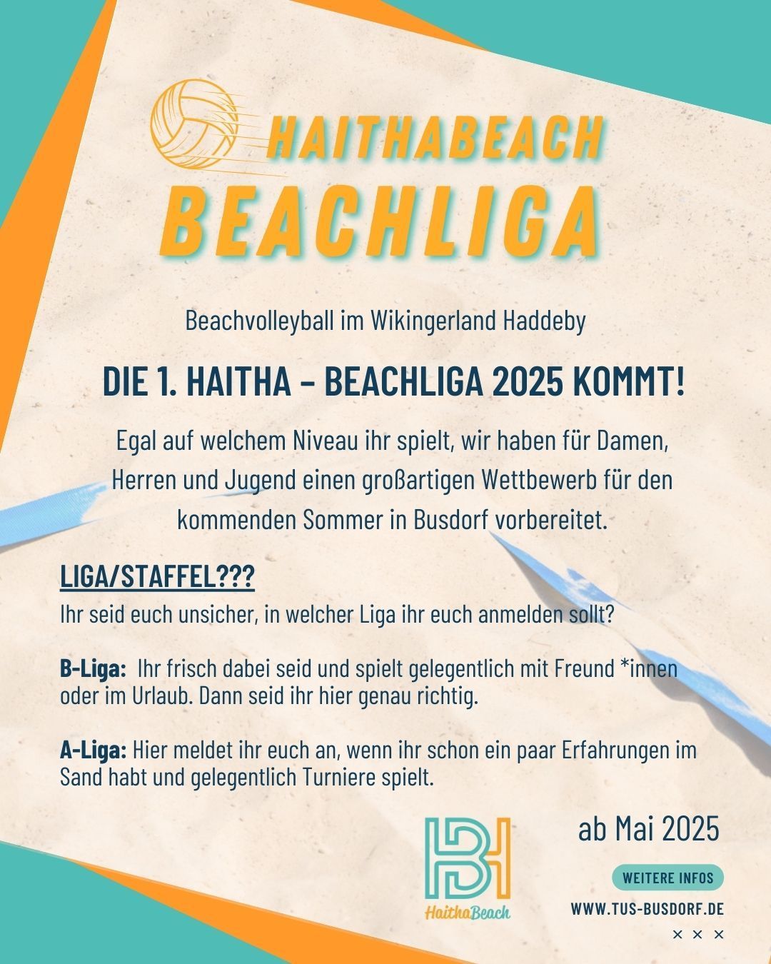 Die Haithabeach-Beachliga 2025 startet. Melde dich jetzt an indem du das Anmeldeformular ausfüllst und an volleyball@tus-busdorf.de sendest!